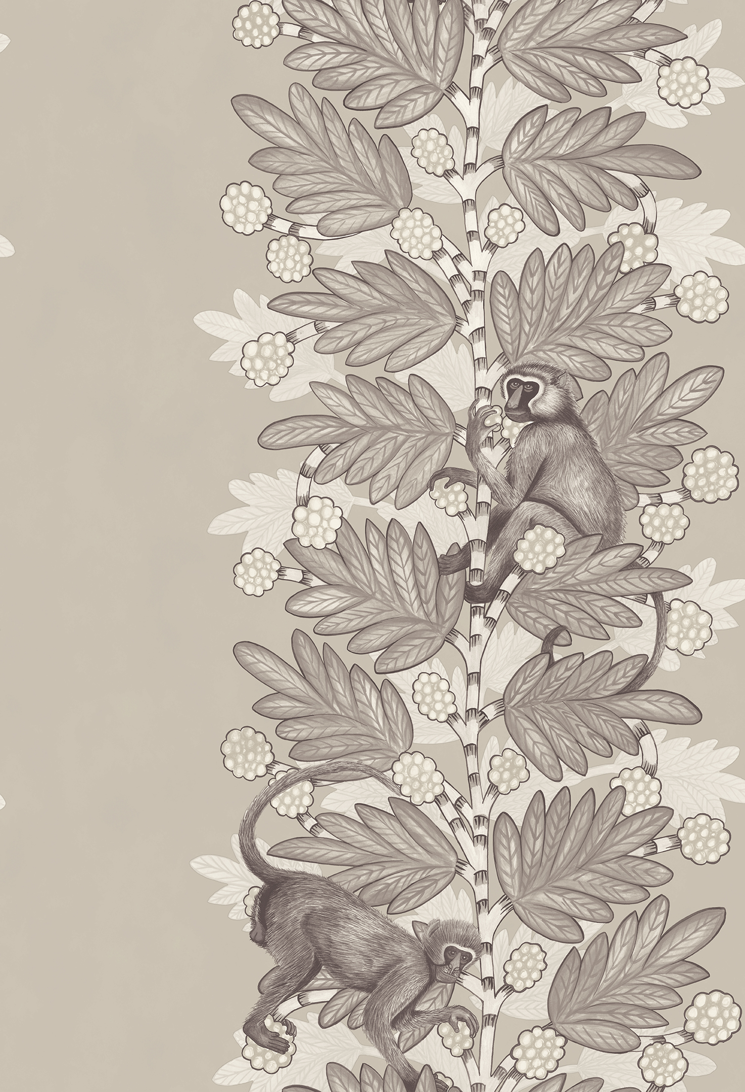 Acacia 109-11054 wallpaper is a beautifully flowing, patterned wallpaper.   The Acacia tree is an enduring sight in Africa with its bright yellow ‘fluff-ball flowers, and holds warm memories for Ardmore founder Fee Halsted.   Having always had monkeys around her as a child, these humorous animals full of wit, pranks and intelligence have created a soft spot in her heart, and in turn have provided the inspiration for this striking new ‘conversational’ wallpaper. Designed to create a wide striped effect, this paper is subtle yet will add drama, especially with the addition of our two charming pranksters.