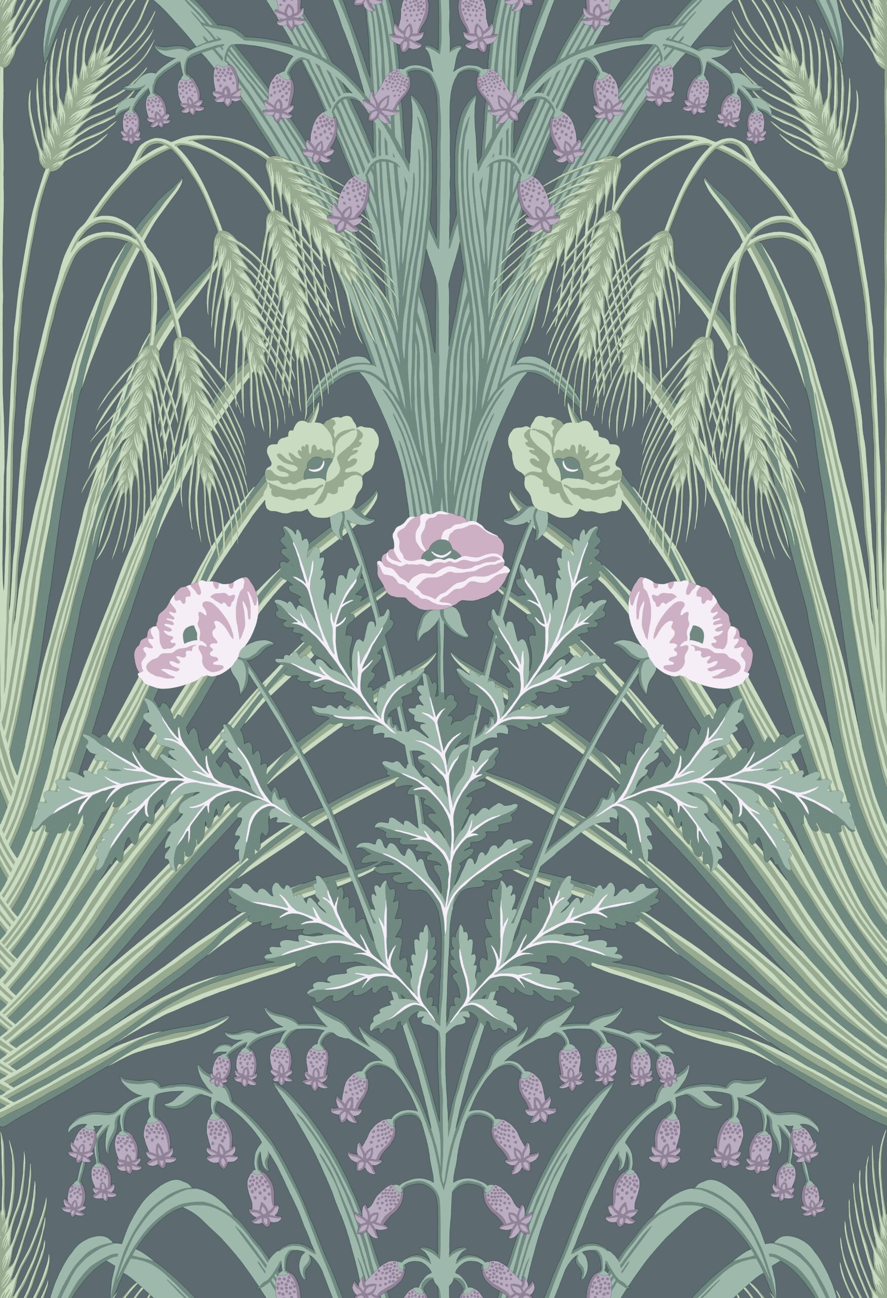 A symphony of tone and texture, Bluebell’s botanical fretwork of wild field flowers is arranged in divine Art Nouveau style. With the delicately arching plume of wheatgrasses waving in the breeze, to the proud company of poppies at its heart, the Hyacinthoides non-scripta sits in a resplendent frame with its elegant, bell-shaped flora. Produced in tonal colourings of Spring Greens & Cerulean Sky on Cream, Sage, Mint & Lilac on Charcoal, and a striking Teal, metallic Gold & Coral on Petrol, this field of flora is abundant in bloom throughout the seasons