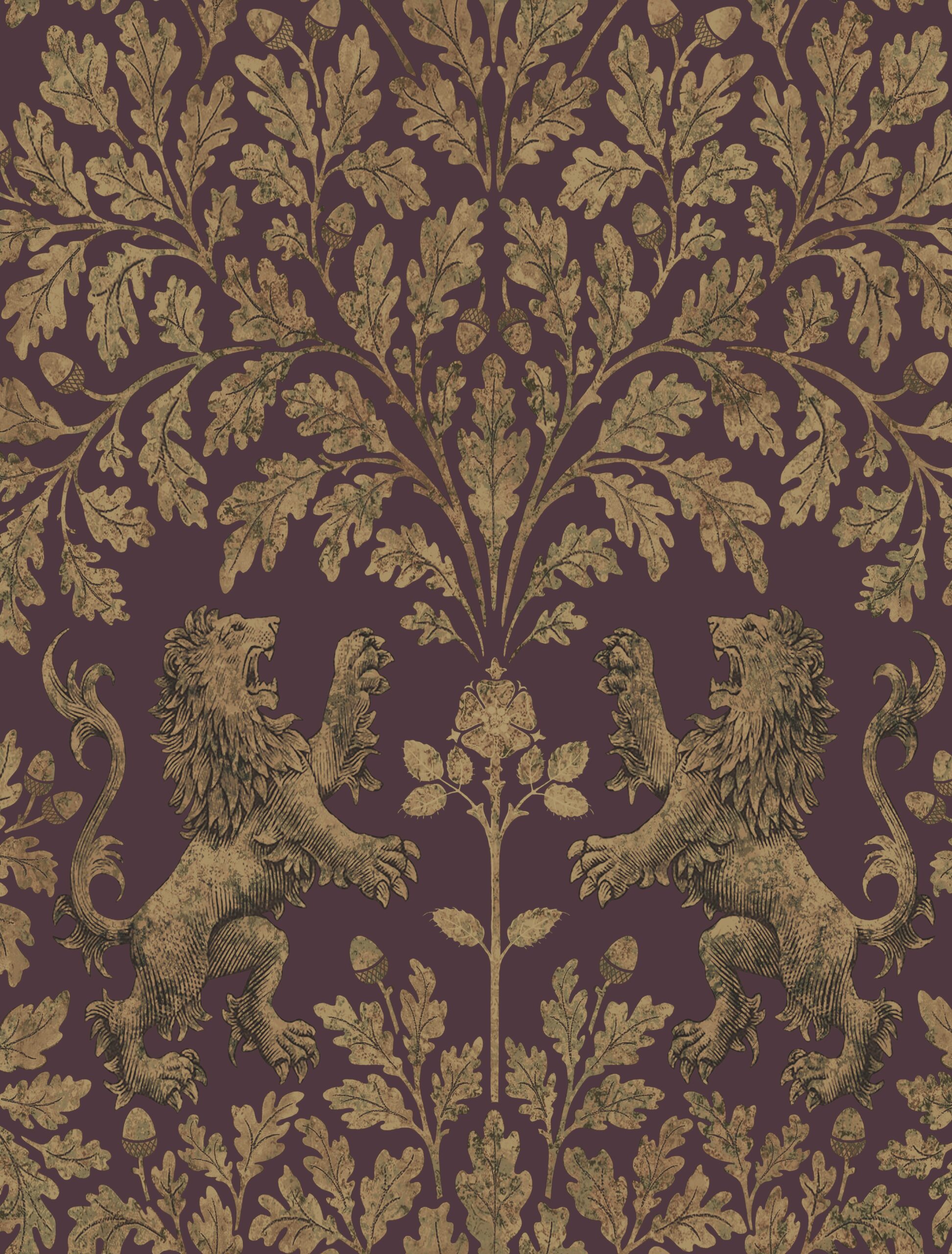 Boscobel Oak 116-10038 wallpaper, combines many of the monarchical symbols of England such as the Tudor Rose, roaring lion, and the oak tree, Boscobel Oak is a unique take on a traditional damask print.