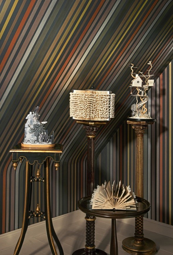 Carousel Stripe 108/6031 wallpaper design, was originally produced using a stripe pan, each section in the pan housed a separate colour and was filled by hand to produce this complex and beautiful striped wallpaper. Due to the ten striking metallic colours, the Carousel Stripe continues to be one of the most technically difficult designs to produce.