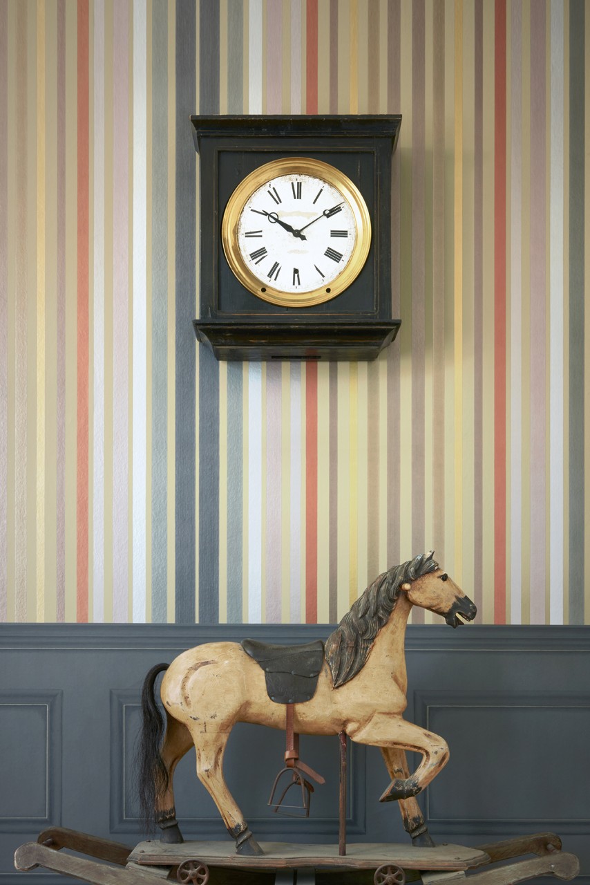 Carousel Stripe was originally produced using a stripe pan, each section in the pan housed a separate colour and was filled by hand to produce this complex and beautiful striped wallpaper. Due to the ten striking metallic colours, the Carousel Stripe continues to be one of the most technically difficult designs to produce.