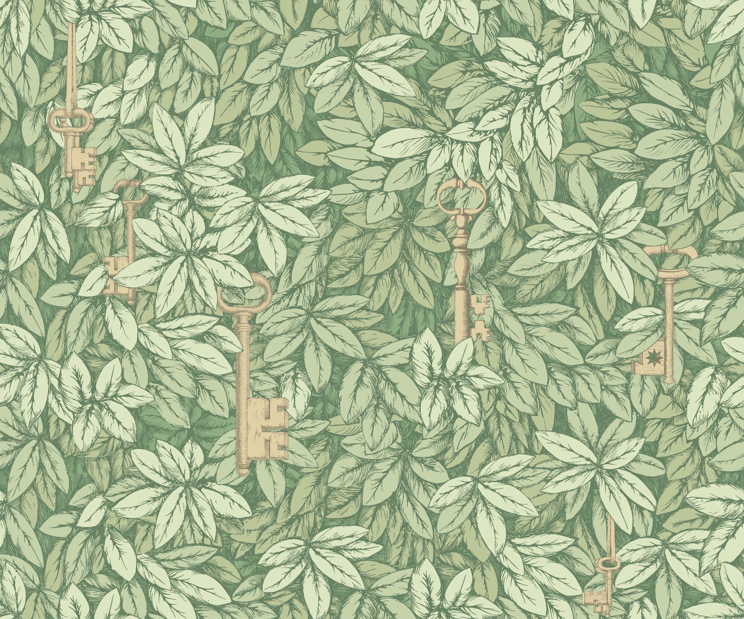 Chiavi Segrete 114-9018 wallpaper, combines two influential Fornasetti motifs: mystical, dense leaves concealing golden, antique keys. This fanciful design has a magical quality, drawing the eye through and around the leaves to discover each of the ‘secret keys’ hidden within. Warm gold and sage tones comprise the subtly lustred Gilver and Gold, whilst Olive creates a soft, true-to-life tone of spring undergrowth, with a seasonal twist in Autumnal Leaves’ deep rouge red and bronze hues.