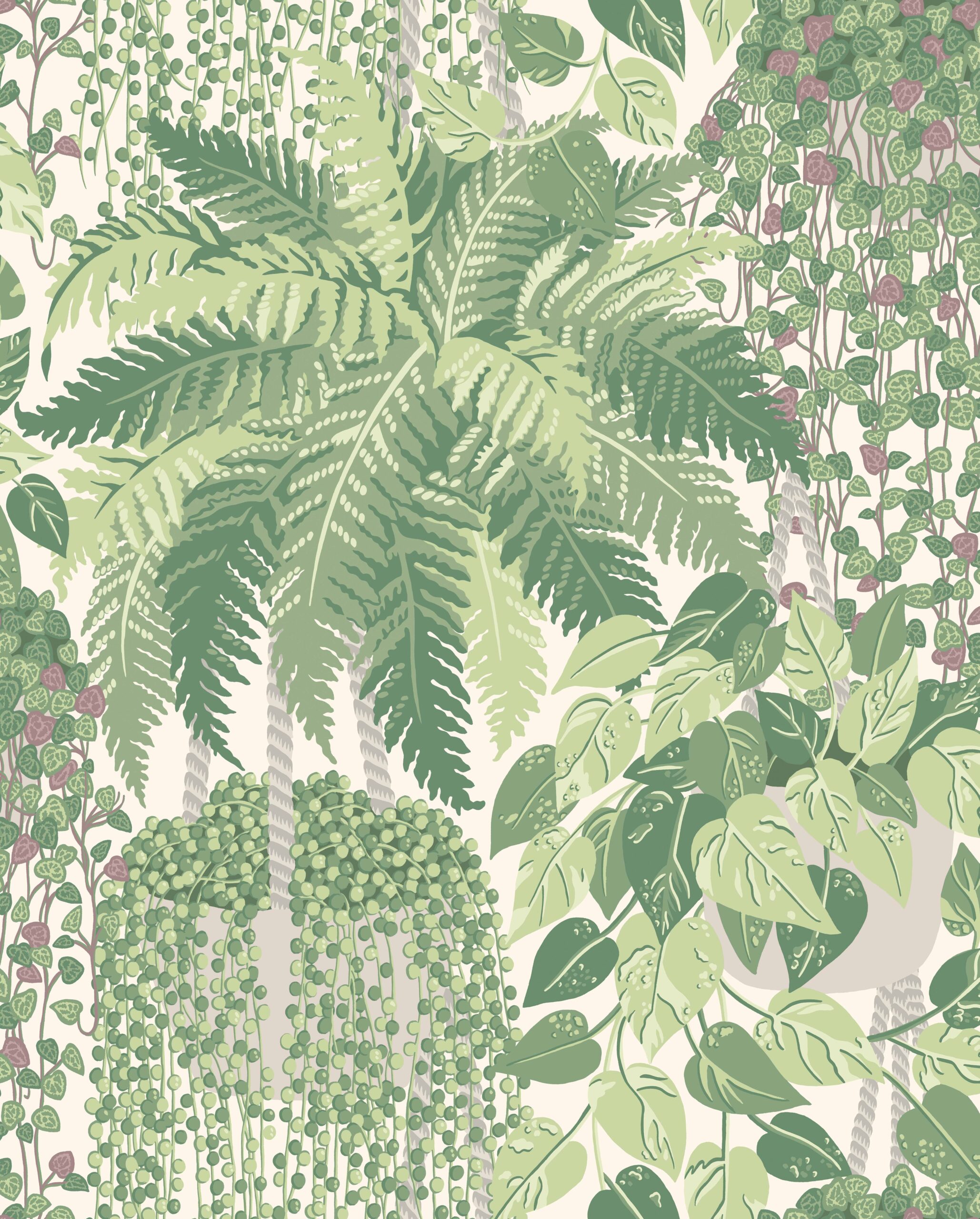 Fern takes us from the garden to the glasshouse where trailing String of Pearls spill from handmade macramé baskets and planters. This distinctly British botanical is a continuation of Cole & Son’s many striking studies of plant life, such as Palm Jungle and Palm Leaves, with its hand-rendered, illustrative style in high summer palettes of Leaf Green & Olive as well as the dusky, winter tones of Viridian & Teal.