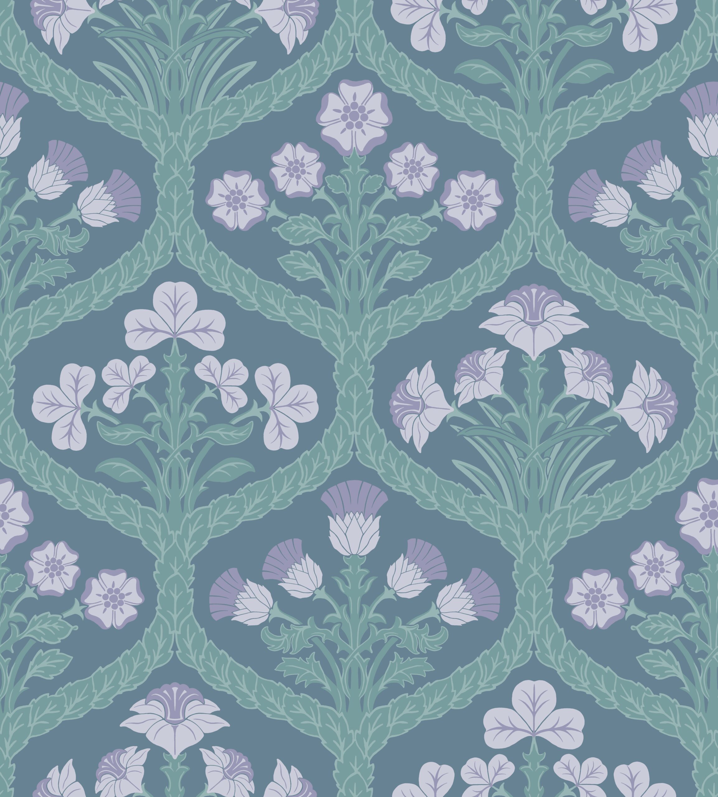 Floral Kingdom 116-3011 wallpaper has taken its inspiration from Gothic Revival design and is a softer ogee design made of knotted leaves and each of the United Kingdom’s national flowers: spring time daffodils for Wales, fragrant roses for England, the bursting rosettes of the Scottish thistle, and the delicate shamrock sprig representing Northern Ireland.