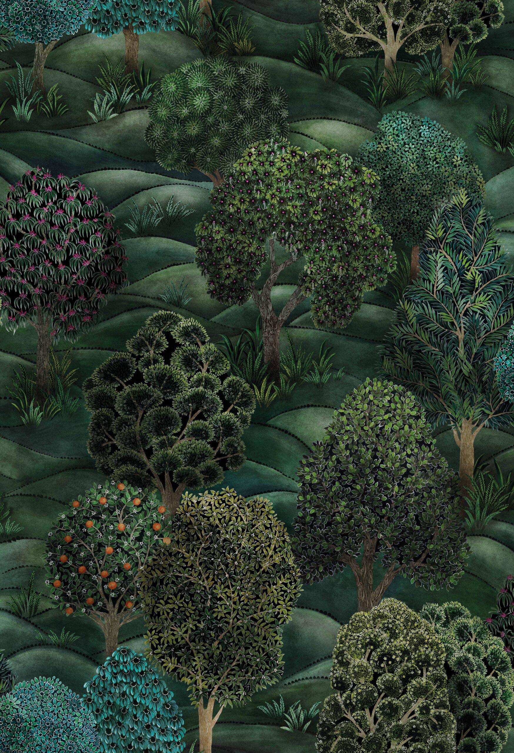 It’s no wonder that Silvan forests feature so heavily throughout literature and folklore; the sense of being wholly enveloped upon stepping into an array of trees and undergrowth as far and wide as the eye can see creating an awe-inspiring feeling. Translated here in Forest’s large-scale, intricately hand-painted, fantastical trees, the dappled light traverses through far off branches as the dense ground cover emits the warm and welcoming woody fragrance of childhood memories.