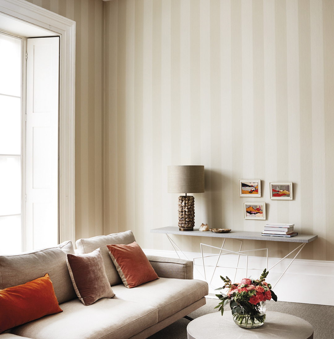 One of Cole & Son’s oldest designs, the Jaspe wallpaper has an enduring and refined air of elegance. Historically produced by hand at the Cole & Son factory in North London with a random brush effect, the design has been modernised and placed in a large stripe repeat to create a balanced, yet seemingly irregular strié in a wide range of sophisticated colourings. Interior image features Jaspe Stripe 110/4022 with Jaspe 110/4019