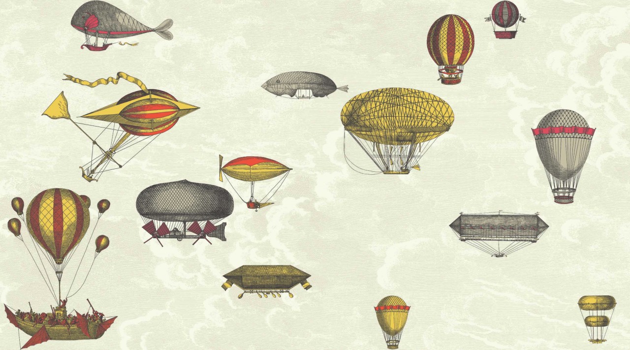 Comprising fifteen designs, Cole & Son’s new collection follows the success of the first Fornasetti range, launched in 2008, delivering a repertoire of magical themes within a collection of designs that are at once iconic and covetable. Fornasetti II takes a bold step in wallpaper design, transcending the obvious and transforming eclectic and whimsical drawings into a truly stunning array of co-ordinating wallpapers in an exciting range of colours and styles. Eccentric motifs of fantastical flying machines, architectural details, playful monkeys, keys and owls all evoke a theatrical and magical space, while the use of wide width friezes, borders, digital panels and double width papers gives this collection an unparalleled diversity in the way in which it can be used. Commenting on the new collection, Barnaba Fornasetti stated: “Pablo Neruda once described my father as the magician of precious and precise magic and I think that this decorative collection beautifully captures the magic essence of the Fornasetti world”. MACCHINE VOLANTI Floating on a new version of Nuvole, these wondrous flying machines hang amongst the clouds evoking the romantic New World of scientific exploration. The three colourways are drawn in two shimmering versions of silver and bronze on pale blue and midnight skies and a third more playful colouring of red and yellow on a neutral sky. This design has been devised so that it directly co-ordinates with both Nuvolette and Balaustra and is a total of 137cm wide, thereby being sold as a set comprising two wide width rolls of 68.5cm each. NB. Price shown is per set of 2 rolls of wider width, each being 10m long x 68.5cms wide, with a 76cms half-drop pattern repeat. Under the terms of our licence with Cole & Son, we can only supply their products within the UK.