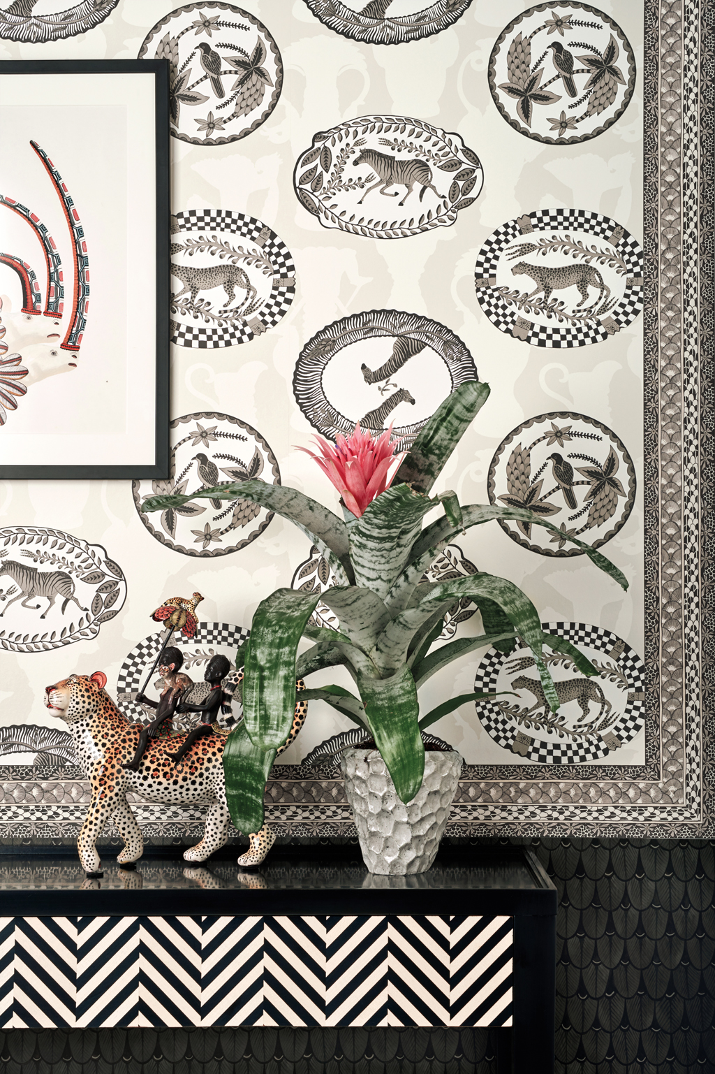 Matrinah 109/4019 is from the charming and stylish new range of wallpapers and borders in collaboration with Ardmore Ceramic Art celebrating African traditions and culture. Drawing inspiration from Ardmore’s colourful and quirky ceramics the collection explores Africa’s exotic flora and majestic fauna: from rare birds to big cats, elephants, rhinos and mischievous monkeys; as well as the beautiful patterns of Zulu beadwork and woven basket ware.