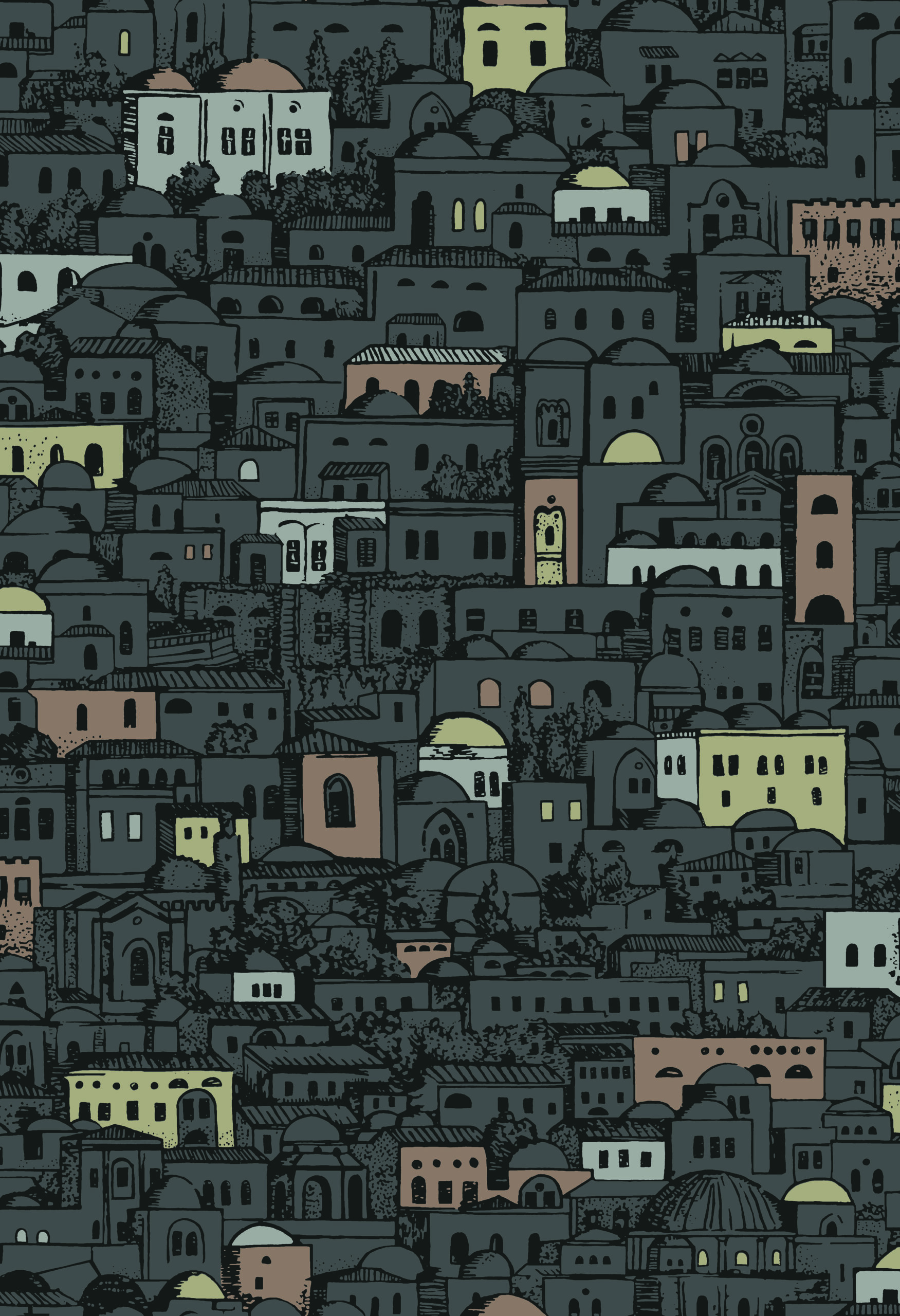 Originally conceptualised in the late 1940s for the entrance hall of Piero Fornasetti’s Milan residence, but somehow remaining timeless, Mediterranea is a sprawling cityscape of roofs, domes, and windows. Each detailed element of the scene is brought to life through radiant Metallic highlights and bold line work, with striking ground hues of White and Charcoal – altogether quite striking.