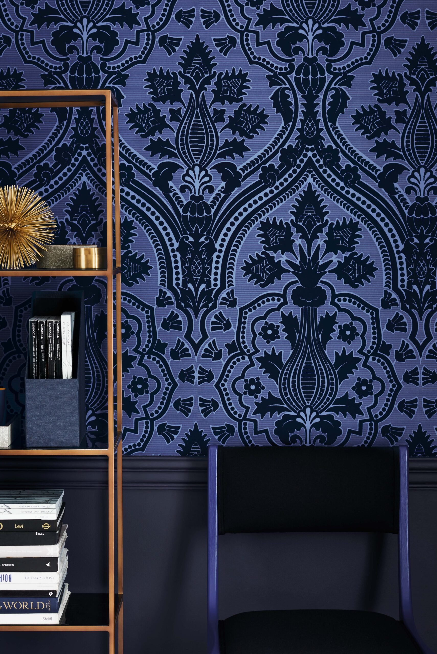 Delicate flocking, a production process which intimates cut velvet, enhances the rich decadence of the design. Choose from sumptuous tones of Dark Hyacinth; Claret; and Charcoal.