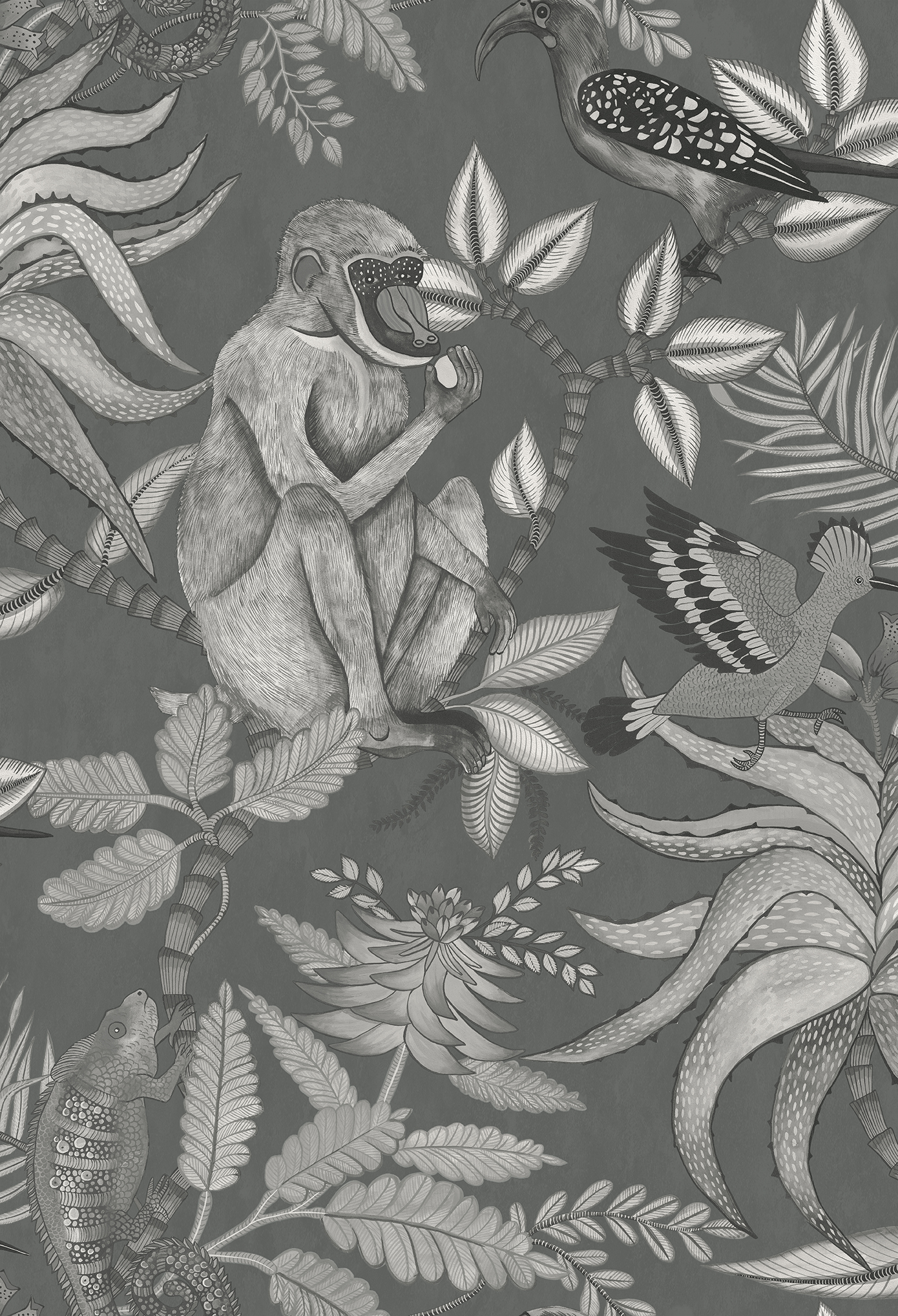 The Savuti is one of Africa’s most loved and well known national parks where hoopoes and hornbills call and sing whilst baboons and chameleons sun themselves in flowering Coral Trees. This wonderful African garden has been recreated as a wallpaper in seven colourful and distinctive colourings each offering a different look – a bright orange and charcoal with a monotone engraved feel – a duck egg and old stone with a more faded and antique illustrative tones, and a series of three brightly coloured more child-like colourings on grounds of cram, dark petrol and khaki.