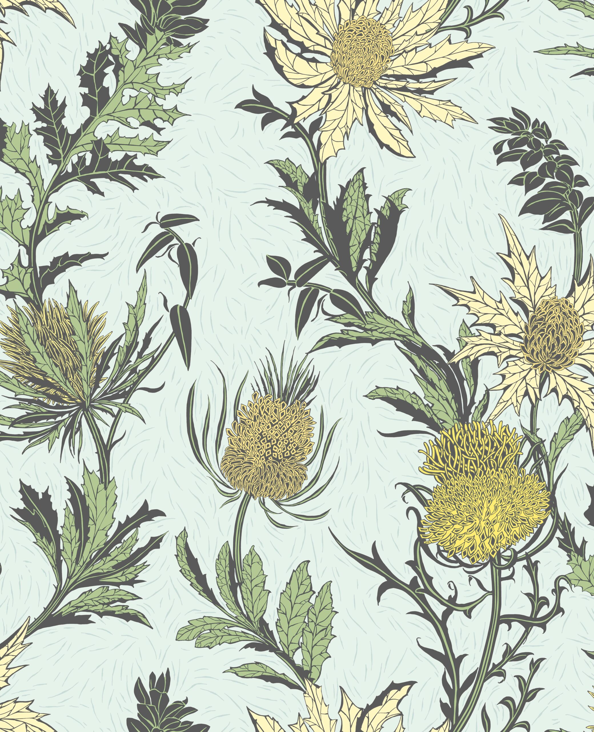One of the many floral symbols of the British Isles, the unconventional beauty of the Thistle is in its graphic shape of spiny bracts and bursting rosettes. This bold trail design has been printed to reflect a screen print, with a chalky, matte finish to enhance the brittle shape of this stunning wild flower. Seasonal palettes of fresh Lemon & Olive on Duck Egg, muted Alabaster Pink & Orange on Parchment, and a hazy Lilac & Cerise on White enhance this striking motif of iconic blooms.